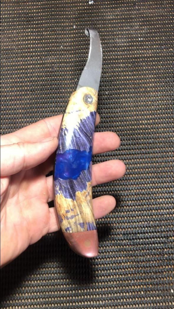 Die schwarzen Schlieren kommen von einem Pilz, der das bereits seit längerem tote Holz befällt und den ersten Schritt seiner Zersetzung einleitet. Die Optik die man hier erhält ist unvergleichlich. Das Holz wurde unter zuhilfenahme eines Vakuums mit Epoxidharz durchzogen, wodurch es sehr stabil und auch relativ schwer wird. Schwerer noch als dieses Hybridholz ist der Block Ebenholz der den Griff abschließt. Die Gewichtung erweist sich bei der Arbeit am Huf als sehr vorteilhaft und angenehm!