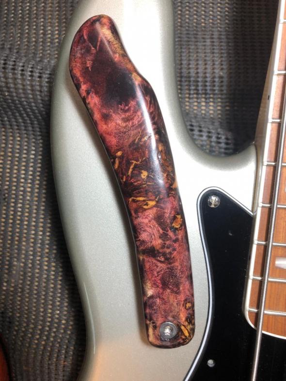 Relativ seltenes und teures Holz, das durch Fehlwüchse entsteht. Hier mit einem Astloch, das mit blau gefärbtem Epoxidharz gefüllt wurde.