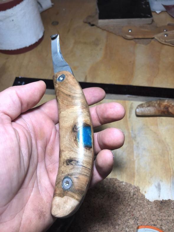 Die schwarzen Schlieren kommen von einem Pilz, der das bereits seit längerem tote Holz befällt und den ersten Schritt seiner Zersetzung einleitet. Die Optik die man hier erhält ist unvergleichlich. Das Holz wurde unter zuhilfenahme eines Vakuums mit Epoxidharz durchzogen, wodurch es sehr stabil und auch relativ schwer wird. Schwerer noch als dieses Hybridholz ist der Block Ebenholz der den Griff abschließt. Die Gewichtung erweist sich bei der Arbeit am Huf als sehr vorteilhaft und angenehm!