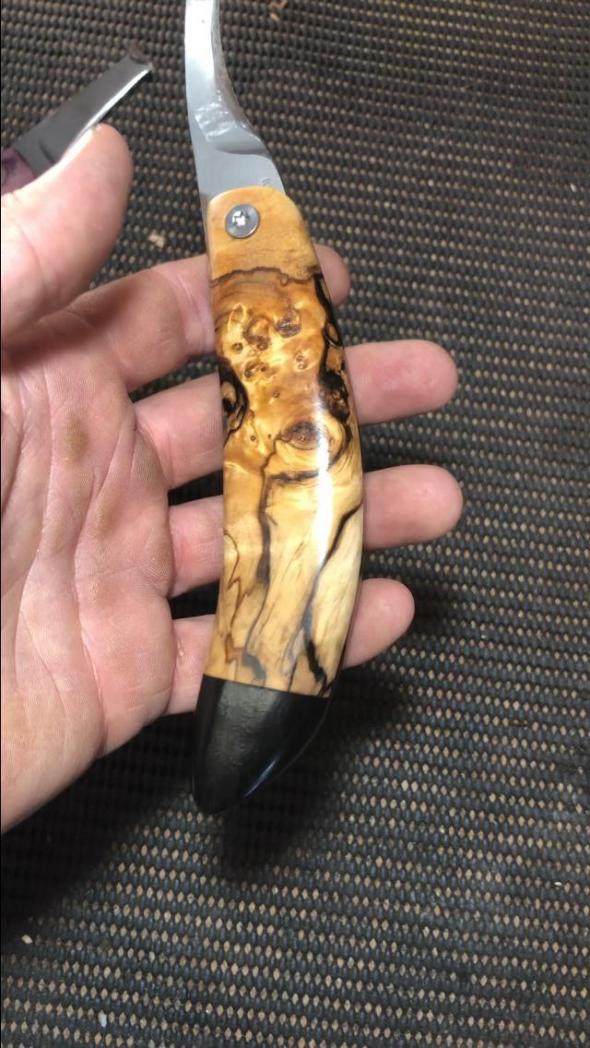 Die schwarzen Schlieren kommen von einem Pilz, der das bereits seit längerem tote Holz befällt und den ersten Schritt seiner Zersetzung einleitet. Die Optik die man hier erhält ist unvergleichlich. Das Holz wurde unter zuhilfenahme eines Vakuums mit Epoxidharz durchzogen, wodurch es sehr stabil und auch relativ schwer wird. Schwerer noch als dieses Hybridholz ist der Block Ebenholz der den Griff abschließt. Die Gewichtung erweist sich bei der Arbeit am Huf als sehr vorteilhaft und angenehm!